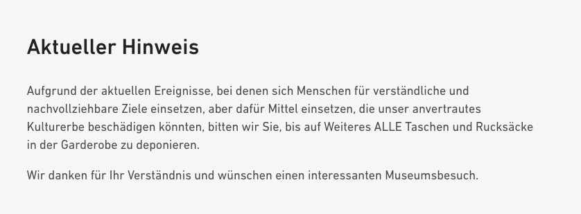 sodele. heute ein hinweis auf einen hinweis. tbz hat das hier beim kunsthaus zueri auf der website entdeckt (siehe auch screenshot*beweis*): Aktueller Hinweis Aufgrund der aktuellen Ereignisse, bei denen sich Menschen für verständliche und nachvollziehbare Ziele einsetzen, aber dafür Mittel einsetzen, die unser anvertrautes Kulturerbe beschädigen könnten, bitten wir Sie, bis auf Weiteres ALLE Taschen und Rucksäcke in der Garderobe zu deponieren. Wir danken für Ihr Verständnis und wünschen einen interessanten Museumsbesuch. tbz hat sich gefragt, wer in einem museum genau dafuer zustaendig ist solche mitteilungen zu verfassen und wie lange man wohl braucht sich zu ueberlegen wie man sowas genau nett und halbwegs klar formulieren soll und ob verstaendlich und nachvollziehbar irgendwie gleiches oder eher aehnliches bedeuten? und dass ein aktueller hinweis sich auf aktuelle ereignisse bezieht ... und aber auch einfach: irgendwie lustig, das ganze. wenn man sich ueberlegt, was es eigentlich heisst und wie man das klarer machen koennte: "bitte nehmen sie keine suppe mit in die ausstellung" oder "leim bitte nur in den hosentaschen, danke!" so.ihr wisst bescheid. weite, wallende gewaender tragen, baggy-jeans mit aufgesetzten taschen, so zeug. -- = -- -- = -- -- = -- a n a . w o r d s aus dem hellblauen salon furcht und schrecken seit 1997 mailto:words@ana.ch http://ana.raskinwp.ch/words/ ana.txt seite 444 vragen & kommentare & texte, die ihr davon findet, sie seien es wert, dass es die ganze welt erfaehrt, oder mindestens die redaktion, dann mailto:words@ana.ch du willst auch? immer mehr? dann abonnier auch du ana.words: http://ana.raskinwp.ch/txt/444 hast du genug? immer weniger? dann bestell doch nicht ana.words ab: http://ana.raskinwp.ch/txt/444