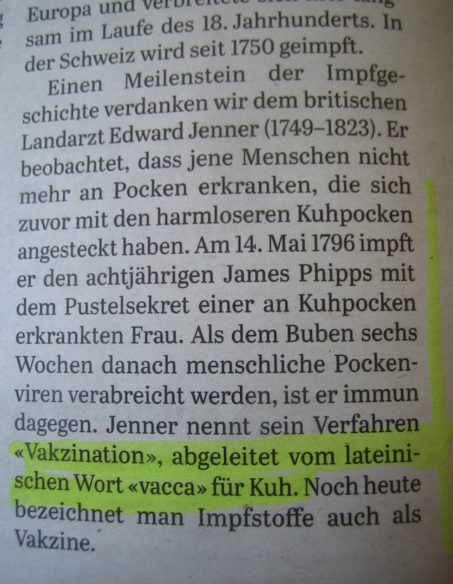 wusstet ihr dass das vakzin von der kuh kommt? (siehe bild) tbz wusste das nicht und liebt's solch aha-erlebnisse zu haben. stand so in der aktuellen coop-zeitung. statt die impfe und der impfsaft koennte man vielleicht auch sagen man geht chuehlen. es chuehlet erfaehrt eine bedeutungsverschiebung. schoenes wochenende, muh! -- = -- -- = -- -- = -- a n a . w o r d s mit bildern. von euch gescannt, gemalt, photographiert, gezeichnet. ihr malt, wir versenden. a n a . w o r d s aus dem hellblauen salon mailto:words@ana.ch http://ana.raskinwp.ch/words/ ana.txt seite 444 vragen & kommentare & texte, die ihr davon findet, sie seien es wert, dass es die ganze welt erfaehrt, oder mindestens die redaktion, dann mailto:words@ana.ch du willst auch? immer mehr? dann abonnier auch du ana.words: http://ana.raskinwp.ch/txt/444 hast du genug? immer weniger? dann bestell doch nicht ana.words ab: http://ana.raskinwp.ch/txt/444