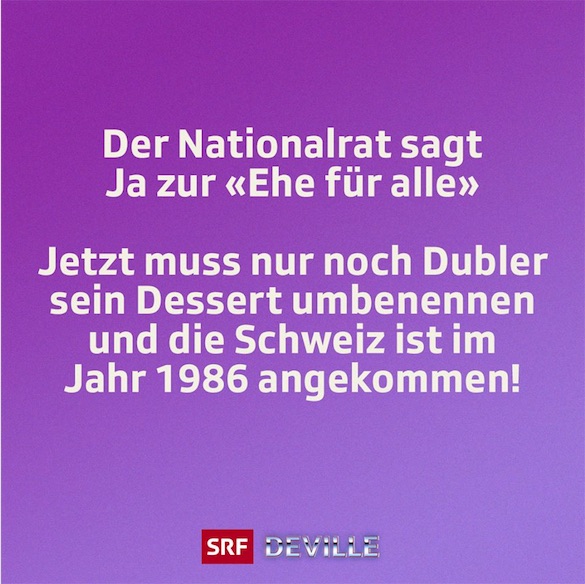 ERSTENS: tbz will gern etwas froehlichkeit verbreiten: momoll, potztuusig, der nationalrat sagt anno 2020 ja zur ehe fuer alle. das allein kann einem ja schon bisschen absurd vorkommen, egal ob das vorgeplaenkel 4 oder 6,5 oder 50 jahre dauerte; 2020 war ja frueher mal sozusagen als ferne und fortschrittliche zukunft gedacht, gaellit, eher mit ner weltregierung oder foederation der vereinigten planeten und gleichberechtigung und so zeug und nicht sowas wie jetzt rundum eher herrscht. so ne leistung ist das ja irgendwie nicht, duenkt es einen. also versteht ihr, was tbz meint? und dann kommt als naextes nun eh erst noch der staenderat und beraet. entschieden ist noch gar nix. mal sehen. und dann kommt das referendum (hier koennt ihr euch darueber aufm laufenden halten: http://ehe-erhalten.ch/ ), und dann kommt ein baeumiger abstimmungskampf, in dem natuerlich niiiiiemand etwas gegen schwule und lesben hat (bisexuelle und transmenschen werden nicht erwaehnt), es aber natuerlich ausschliesslich ums kindeswohl geht. die ehe fuer alle kommt dann aber doch, sagt das volk. in paar jahren. am schluss schaffen wir's noch die ehe abzuschaffen, bevor es sie fuer alle gibt. ha! tbz als spielverderberin. aber freut euch ruhig. ist schon korrekt. ZWEITENS: jammert man in anderen laendern eigentlich auch so viel wegen schoggi wie in der schweiz? (buhuhu, aber staldencreme ist sooo fein, buhuhu, aber laederach-schoggi ist soooo fein, buhuhu, aber die von dubler sind soooo fein.) DRITTENS: zwei bildli. eins von einer satiresendung, und eins von ruedi widmer in der woz von gestern. auch satire wahrscheinlich. eventuell. wobei man dazu schon anmerken muss, dass als man wirklich kurz dachte, banksy habe in zuerich zugeschlagen, sofort eine plexiglasscheibe drueber angebracht wurde. wegen kunst. das war auch lustig: http://izzymag.ch/article/wie-in-einer-nacht-gefeierte-kunst-entsteht-banksy-zuerich schoenes wochenende! -- = -- -- = -- -- = -- p.s. vorgeplaenkel: wahrscheinlich ist 6,5 jahre die richtige antwort. schoggi: stalden = nestlé = ihrwisstschon laederach = evangelikale abtreibungsgegner die alte entlassen dubler = umsverrecke auf "mohrenkopf" bestehen a n a . w o r d s aus dem hellblauen salon words@ana.ch http://ana.raskinwp.ch/words/ ana.txt seite 444 reicht ana.words weiter! vragen & kommentare & texte, die ihr davon findet, sie seien es wert, dass es die ganze welt erfaehrt, oder mindestens die redaktion, dann mailto:words@ana.ch du willst auch? immer mehr? dann abonnier auch du ana.words: http://ana.raskinwp.ch/txt/444