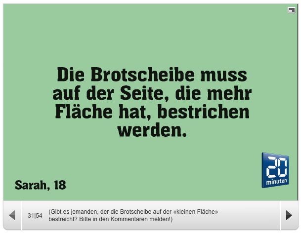 liebes 20minuten nichts gegen diesen (http://www.20min.ch/community/stories/story/-Ich-kuesse-den-Fisch--bevor-ich-ihn-esse--27478333) artikel mit der bildstrecke - also eigentlich ist es ja nur eine bildstrecke gibt ganz, ganz viele klicks und drum geld klick, klick, klick, klick bis zu nummer 54 und dann nochmals von vorne - aber eben, wie gesagt nichts gegen den artikel wenn das thema "macken" nicht interessierte haette ich's wohl nicht angeklickt und aber die hauptfrage die sich mir ja dabei stellt ist was eigentlich ne macke von ner handfesten lebensbehindernden zwangsstoerung unterscheidet und ob ihr nicht vielleicht mal was dazu machen solltet bei diesen lesersrueckmeldungen. und ja, es ist sicher extrem gaebig solche "artikel" zu machen bei denen man nix recherchieren muss bei niemandem nachfragen und keinerlei fakten checken und es einfach dem grafiker rueberreichen kann mit den worten kuck, noch eine einsendung, bitte aufbereiten aber das birgt dann doch eben auch wieder gewisse tuecken denn der grafiker bereitet dann eben nur fuer die klickstrecke auf und es faelt dann niemandem auf dass es - sorry, gaellit - ganz sicher nicht eingebackt heisst! also gopferdami, basics! es heisst "habe eingebacken". vielleicht auch "ich buk ein". aber sicher nicht "habe eingebackt". habe fertig. also fast fertig. bei bild 31 gibt es dann um die treue der lesersschaft oder die aufmerksamkeitsspanne zu ueberpruefen noch nen hidden track - huch, da steht ja unten was! stand da etwa vorher auch schon was? beim letzten und vorvorletzten bild? schnell nochmals alles zurueckklicken... - (und irgendwie gingen die versprochenen 50er-jahre unter kommen aber sicher noch) -- = -- -- = -- -- = -- a n a . w o r d s mit bildern. von euch gescannt, gemalt, photographiert, gezeichnet. ihr malt, wir versenden. a n a . w o r d s aus dem hellblauen salon mailto:words@ana.ch http://ana.raskinwp.ch/words/ ana.txt seite 444 vragen & kommentare & texte, die ihr davon findet, sie seien es wert, dass es die ganze welt erfaehrt, oder mindestens die redaktion, dann mailto:words@ana.ch du willst auch? immer mehr? dann abonnier auch du ana.words: http://ana.raskinwp.ch/txt/444 hast du genug? immer weniger? dann bestell doch nicht ana.words ab: http://ana.raskinwp.ch/txt/444