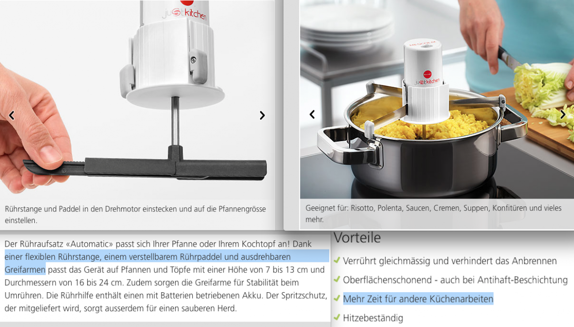 liebe lesers was hat man eigentlich je im leben gemacht BEVOR es betty bossi gab? und dazu braucht's nun einen kleinen einschub (und als vorwarnung: keine ahnung, wann der einschub eigentlich aufhoert): betty bossi, nein, das ist keine real existierende frau. welche betty bossis gibz eigentlich in oesterreich, deutschland, in spanien, honolulu oder sonstwo auf der welt? betty bossi waren frueher schweizer kochbuecher und frau sollte bei rezepten jeweils "sais margarine" verwenden. immer diese oele und margarinen. und wikipedia klaert auf: "Betty Bossi sollte mit einfachen, gelingsicheren Kochrezepten in der butterverwöhnten Schweiz für die vermehrte Verwendung von Margarine und Öl der Marken Astra und Sais werben." und da hat ja jemand bei wikipedia ja wunderschoen formuliert - ein wunder wurde es noch nicht als irrelevant eingestuft - indem er (von "er" ist bei wiki auszugehen) von "butterverwoehnter schweiz" schrieb. das ist schoen und die freude des tages irgendwie. schreibt's euch hinter die ohren: die butterverwoehnte schweiz. anyway, inzwischen gehoert betty bossi coop, kochbuecher gibz immer noch, und gelingsicher dazu (auch ein fabelhaftes wort!), dazu aber eine enorm wachsende abteilung an convenience food (erhaeltlich im coop, immer als "idee von betty bossi") und ein heftli, mit zutaten, die man dann im coop kaufen kann und - und jetzt kommt's eigentlich - eine magisch anmutende anzahl von sogenannten kuechenhelfern. die haben lustige namen. der beliebte "gipfeler" erleichert das machen von gefuellten gipfeli, ihr wisst schon, schinkengipfeli und so. es gibt sachen namens "lupf-rutsch-knusperblech" und so zeug. es gibt fuer alles etwas. zackwegschnitzer und hauwegdiescheisseruester und geilsuperfeinschnetzler, falls ihr wisst, was ich meine. aus gurken kann man gequirlte kunstwerke drehen und knoepfli in 5 minuten und ein simples blech mit backpapier ist imphall sowas von gestern. aber jetzt, meine damen und herren, jetzt, sind wir endlich in der zukunft angekommen. die selbstruehrende pfanne!!! seit gestern auf dem markt. nie mehr im risotto oder in der polenta ruehren! batterien einfuellen und das teil macht das fuer euch! flexibel, verstellbar und ausdrehbar! nicht wie euer vom klicken schlaff gewordener arm. und das beste und fragwuerdigste an allem: ihr habt dadurch mehr zeit fuer andere kuechenarbeiten! das steht so in der werbung. ungelogen. kuckt ihr bilder. tbz wuenscht gutes kochen und essen und gutes wochenende! -- = -- -- = -- -- = -- a n a . w o r d s aus dem hellblauen salon words@ana.ch http://ana.raskinwp.ch/words/ ana.txt seite 444 reicht ana.words weiter! vragen & kommentare & texte, die ihr davon findet, sie seien es wert, dass es die ganze welt erfaehrt, oder mindestens die redaktion, dann mailto:words@ana.ch du willst auch? immer mehr? dann abonnier auch du ana.words: http://ana.raskinwp.ch/txt/444