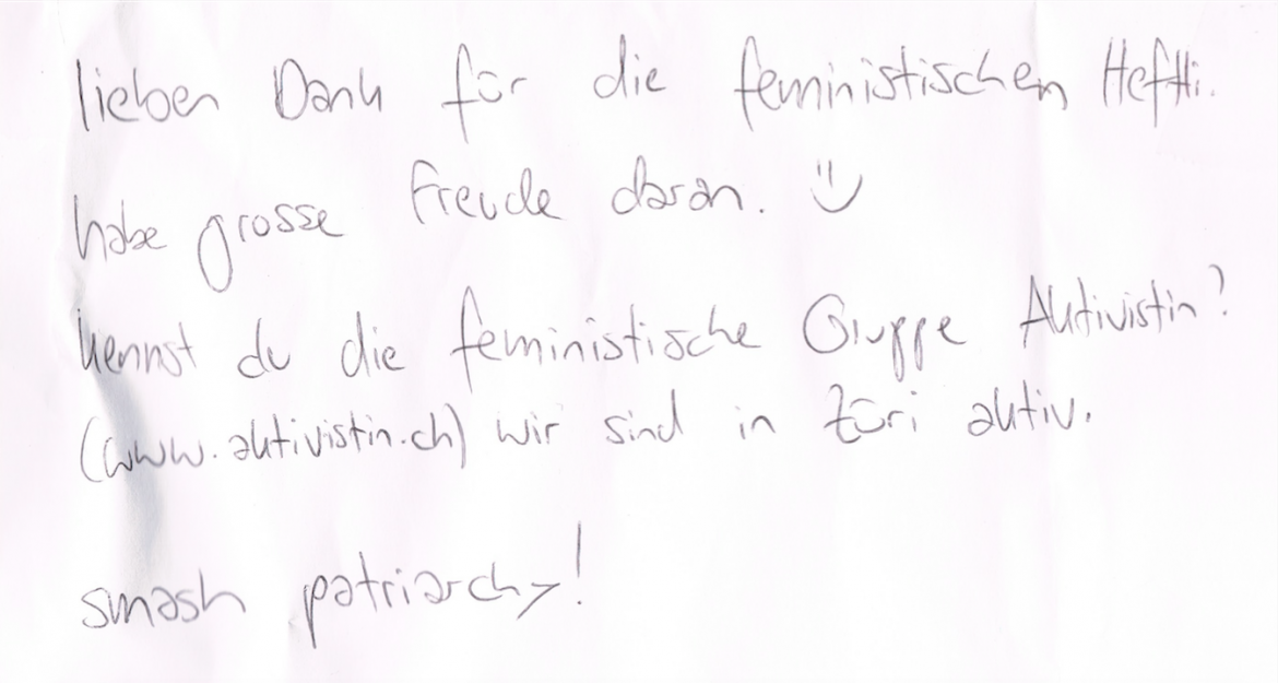 tbz liebt ja das gratiskistensystem und fuellt immer wieder mal ihre kiste mit sachen die so anfallen beim ausmisten und am naexten sonnigen tag kommt die kiste wieder an den strassenrand. heute wurden buecher reingefuellt die fuer den second-hand-markt zu schlecht zwaeg waren und fuer das altpapier zu gut. die kiste schluckt alles glaeser, spielzeug, buecher, tassen, schmuck und wer die dinge weiter besitzt und nuetzt weiss nur die fantasie aber diese fantasie ist schoen. und die kiste musste bisschen entstaubt werden und der inhalt neu gebueschelt weil sie nun nen monat einfach drinnen rumstand und da merkte tbz dass ein zetel dranklebte unbemerkt seit ueber nem monat siehe bild. bei http://www.aktivistin.ch stecken also sachen von tbz! auch die schneekugel? welches buch? besteck? nur die hefte? schoen! -- = -- -- = -- -- = -- a n a . w o r d s mit bildern. von euch gescannt, gemalt, photographiert, gezeichnet. ihr malt, wir versenden. a n a . w o r d s aus dem hellblauen salon mailto:words@ana.ch http://ana.raskinwp.ch/words/ ana.txt seite 444 vragen & kommentare & texte, die ihr davon findet, sie seien es wert, dass es die ganze welt erfaehrt, oder mindestens die redaktion, dann mailto:words@ana.ch du willst auch? immer mehr? dann abonnier auch du ana.words: http://ana.raskinwp.ch/txt/444 hast du genug? immer weniger? dann bestell doch nicht ana.words ab: http://ana.raskinwp.ch/txt/444