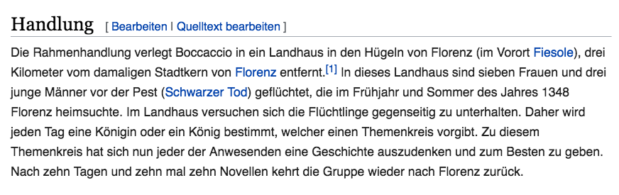 tbz denkt schon laenger am decamerone rum (und inzwischen haben das diverse aufgegriffen - jaa, tbz' gehuern ist manchmal schnell - zum beispiel hier: http://www.tagesspiegel.de/kultur/seuchen-in-der-literatur-krankheit-als-zeitraffer/25594584.html oder hier: http://www.deutschlandfunkkultur.de/coronavirus-warum-isolation-kuenstlerisch-produktiv-sein.1013.de.html?dram%3Aarticle_id=472024 ) und ob man da nicht ein viral gehendes quarantaenespiel draus machen koennte. wir spielen dekameron. die idee ist extrem einfach: wir erzaehlen uns geschichten. das ist eigentlich alles. grundidee (decamerone): siehe bild. geschichten zur unterhaltung in kontaktarmen zeiten in kulturarmen zeiten (also kultur hier als grossveranstaltung) sich was erzaehlen als eine interaktion zwischen dir und mir als eine beruehrung ohne anfassen als eine abwechslung im home office als ein kreativer akt gegen die starre. wie koennte man das machen? zum beispiel in social media als kettenbrief so ein copy-paste-ding bei dem man einen vorgefertigten text postet eine geschichte erzaehlt - zum beispiel bei fb im ersten kommentar, als bildergeschichte bei instagram - (aber achtung wegen der zensur die originalgeschichten jedenfalls sind zum teil bitz porno) und ein neues erzaehlkoenig ernennt. aber tbz mag diese kettenbrief-ich-tagge-dich- geschichten nicht so gern. man koennte ja aber auch einfach fragen: willst du #daserzaehlkoenig sein? andere idee: fortsetzungsgeschichten. jemand faengt an drei andere schreiben weiter weisch, exponentiell as fuck!! das waere sicher auch schoen fuer tiktok vortanzen, nachtanzen, weitertanzen die musik stirbt zuletzt. und auf twitter sowohl als thread als auch fortsetzungsgeschichte mit subthreads und erwaehnungen und insgesamt mega unueberschaubar, haha, und jemand druckt es dann am schluss als buch oder netflix macht bandersnatch II draus. aber eventuell waere lineares erzaehlen grad beruhigender... vielleicht moechte das ja jemand fuer die socials ausformulieren zum einfach teilen und sonst auch: dieses ana.word als mail weiterleiten oder den link dazu teilen wenn ihr die idee moegt tbz faengt mal mit einer geschichte an und erzaehlt dann morgen weiter: am tage, als die voegel vom himmel fielen, (http://tinyurl.com/sfs8s2h) war tbz an ein fest geladen das 40 lebensjahre aber nicht annaehernd so viele geburtstage feierte. und es herrschte grosse verwirrung darueber ob man sich die haende geben sollte oder nicht und ob man sich kuessen sollte oder nicht und ob man sich umarmen sollte oder nicht. und als man sich zu tische begab und von seinem tellerchen ass und von seinem glaeschen trank... (fortsetzung morgen) spread it! #daserzaehlkoenig -- = -- -- = -- -- = -- a n a . w o r d s aus dem hellblauen salon words@ana.ch http://ana.raskinwp.ch/words/ ana.txt seite 444 reicht ana.words weiter! vragen & kommentare & texte, die ihr davon findet, sie seien es wert, dass es die ganze welt erfaehrt, oder mindestens die redaktion, dann mailto:words@ana.ch du willst auch? immer mehr? dann abonnier auch du ana.words: http://ana.raskinwp.ch/txt/444 hast du genug? immer weniger? dann bestell doch nicht ana.words ab: http://ana.raskinwp.ch/txt/444