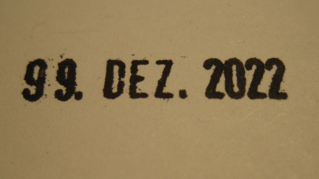 zu beginn dieses neuen monats moechte euch tbz noch kurz das ende der welt verkuenden. tbz hat einen datumsstempel und musste nun leider feststellen dass nach 2022 nichts mehr kommt. die jahre sind aufgebraucht. die gute nachricht: der dezember geht deshalb ausnahmsweise etwas laenger. bis zum 99. dezember 2022. siehe bild. danach ist sense. OOOODER wahlweise faengt es bei 2011 wieder an. ihr koennt waehlen, was ist euch lieber? [ ] ende gelaende [ ] history repeating -- = -- -- = -- -- = -- ukraine: watson hat eine zusammenstellung gemacht wie/wo man helfen kann: https://bit.ly/3C3ZCrN da bisher nicht aufgefuehrt ist diese aktion wo man auch plaetze bei sich anbieten kann: https://campax.org/solidaritaet-mit-ukraine/ -- = -- -- = -- -- = -- a n a . w o r d s mit bildern. von euch gescannt, gemalt, photographiert, gezeichnet. ihr malt, wir versenden. a n a . w o r d s aus dem hellblauen salon vragen & kommentare & texte, die ihr davon findet, sie seien es wert, dass es die ganze welt erfaehrt, oder mindestens die redaktion, dann mailto:words@ana.ch du willst auch? immer mehr? dann abonnier auch du ana.words: http://ana.raskinwp.ch/txt/444 hast du genug? immer weniger? dann bestell doch nicht ana.words ab: http://ana.raskinwp.ch/txt/444