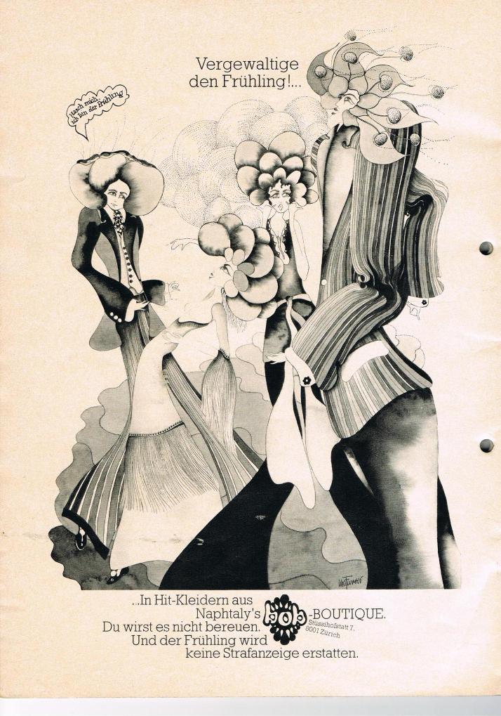 wie versprochen, mehr aus "pop" nicht so zum wetter passend mit dem aktuellen schnee hie und dort aber ansonsten umwerfend in der sprechblase: "hasch mich, ich bin der fruehling" werbetext: "vergewaltige den fruehling!... in hitkleidern aus naphtaly's bob-boutique du wirst es nicht bereuen. und der fruehling wir keine strafanzeige erstatten" genau, vergewaltige du wirst es nicht bereuen und strafanzeige gibz nicht. jesses maria! das ging 1969 noch... -- = -- -- = -- -- = -- a n a . w o r d s aus dem hellblauen salon words@ana.ch http://ana.raskinwp.ch/words/ ana.txt seite 444 reicht ana.words weiter! vragen & kommentare & texte, die ihr davon findet, sie seien es wert, dass es die ganze welt erfaehrt, oder mindestens die redaktion, dann mailto:words@ana.ch du willst auch? immer mehr? dann abonnier auch du ana.words: http://ana.raskinwp.ch/txt/444 hast du genug? immer weniger? dann bestell doch nicht ana.words ab: http://ana.raskinwp.ch/txt/444