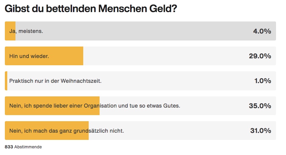 hoppla, schon der letzte tag im februar... zu gestern schrieb wasauchimmer: Ohje… es wird nicht besser 🙈 Danke fürs zerpflücken 😊 machen wir gleich weiter mit werbung denn wenn ein detailhaendler ein magazin rausgibt dann ist das auch journalismus aber eben auch werbung. gut. zuerst kleiner schwenker: habt ihr auch den eindruck es habe zugenommen so in der abteilung "belanglose artikel fuer zwischendurch" dass man staendig auf fehler aufmerksam gemacht wird? also fehler (die haeufigsten, die schlimmsten etc.), die man beim duschen macht oder beim haarewaschen fehler, die man macht beim waesche waschen oder beim bananen schaelen. also irgendwie macht man alles falsch, hat man fast den eindruck. und bei diesem magazin, das auch werbung ist, uebertrieben sie es aber am sonntag irgendwie ein bisschen beim newsletter. es fing an mit den fehlern die man beim rahmschlagen vermeiden soll ging weiter mit dem was man beim lackieren der fingernaegel falsch machen kann und dann noch als titel Diese Flüchtigkeitsfehler bei der Steuererklärung sind teuer und als lead Beim Ausfüllen der Steuererklärung passieren schnell einmal Fehler, die ins Geld gehen. alles macht man falsch. alles voller fehler ueberall. dafuer gab es dann aber auch noch artikel mit anweisungen. also sozusagen wie man etwas fehlerfrei richtig macht. also wie man lebensmittelmotten fuer immer loswird. und das, was tbz vom thema her interessierte - ansonsten hat sie vor weiterhin alles bestimmt falsch zu machen - war ein artikel mit dem titel Soll man Bettlern Geld geben, und wenn ja, wie viel? und dem lead: Bist du auch manchmal unsicher, wie du dich gegenüber Bettlern verhalten sollst? Die wichtigsten Fragen und Antworten. da werden fragen beantwortet offenbar! einmal faq und die sache ist klar. da ist man dann schon irgendwie beruhigt wenn die erste aussage lautet Es gibt kein Richtig oder Falsch. worum's nun aber heute geht: es hat dabei eine umfrage, bei dem artikel: Gibst du bettelnden Menschen Geld? [ ] Ja, meistens. [ ] Hin und wieder. [ ] Praktisch nur in der Weihnachtszeit. [ ] Nein, ich spende lieber einer Organisation und tue so etwas Gutes. [ ] Nein, ich mach das ganz grundsätzlich nicht. von momentan 833 abstimmenden sagen 66% also recht genau zwei drittel dass sie bettelnden menschen KEIN geld geben. also die unteren beiden antworten (nein, lieber einer organisation, nein, grundsaetzlich nicht). 4% geben meistens. 29% hin und wieder. das ist das andere drittel. diese verteilung bestand so auch schon mit 574 abgegebenen stimmen. siehe auch angehaengte bilder. und tbz war ganz baff. tbz haette nicht gedacht. dass eine zweidrittelsmehrheit bettlerns NIE geld gibt. nicht nur ab und zu oder selten also hin und wieder, sondern nie. also natuerlich ist das nicht eine grossangelegte repraesentative umfrage aber trotzdem. sehr klar. kein fuenfliber fuer den junkie? kein zweifraenkler fuer den alki? keine 50 rappen fuer den punk mit hund? kein goldvreneli fuer niemanden? also nichts? nie? sind diese zwei drittel nicht krass? oder findet das nur tbz? und kann nun jemand noch bitte eine zweite umfrage nachliefern in denen die leute nach den gruenden gefragt werden? "dae bruucht's eh nur fuer droge" (ja und) oder "soell halt go schaffe" oder "chunnt doch sicher scho vom sozialamt gaeld ueber" und sowas? danke. (den artikel findet ihr uebrigens hier https://www.migros-engagement.ch/de/news-projekte/zusammenleben/tipps-bettelnde ) p.s. viel liebi fuer schwester ariane https://incontro-verein.ch/ -- = -- -- = -- -- = -- wenn dir dieses ana.word gefiel willst du vielleicht auch dieses lesen http://ana.raskinwp.ch/ana-words-geld-verschenken/ a n a . w o r d s aus dem hellblauen salon furcht und schrecken seit 1997 vragen & kommentare & texte, die ihr davon findet, sie seien es wert, dass es die ganze welt erfaehrt, oder mindestens die redaktion, dann mailto:words@ana.ch du willst auch? immer mehr? dann abonnier auch du ana.words: http://ana.raskinwp.ch/txt/444 hast du genug? immer weniger? dann bestell doch nicht ana.words ab: http://ana.raskinwp.ch/txt/444
