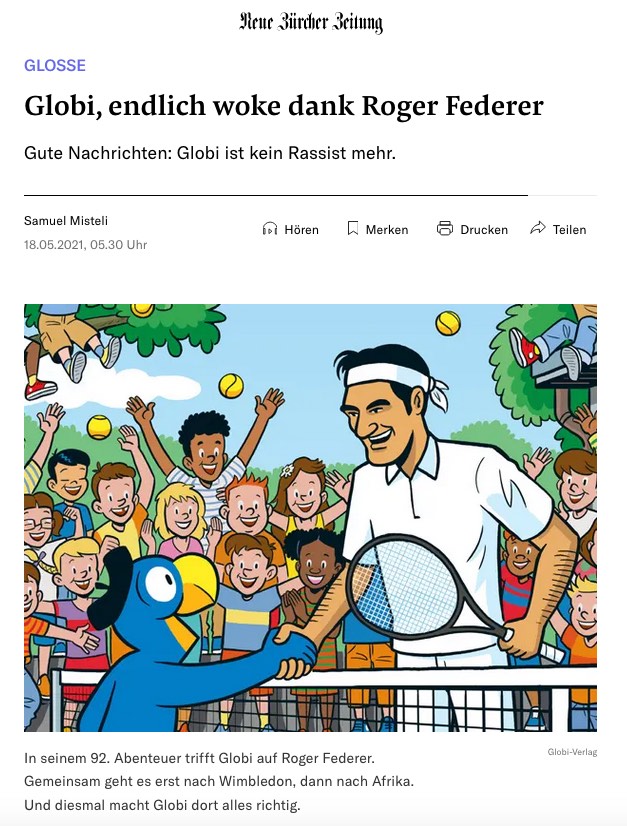 so. tbz muss noch was loswerden zum neuen globibuch. fuer die nichtschweizers: globi ist eine schweizer institution. gestartet als werbefigur fuer das warenhaus globus gibt es seit den 1930er-jahren auch globibuecher. mit schwarz-weissen bildern (zum ausmalen!) - aka comics aka schund - und - wichtig - mit versen zu den bildern. tbz hat sich damit das lesen beigebracht ;-) fuer weitere infos mal der verweis auf wiki: https://de.wikipedia.org/wiki/Globi bei wiki hat tbz auch die ganze liste an bisher erschienenen buechern auf was bestimmtes abgesucht - dazu gleich - und globi betritt diverse lebenswelten (wtf ist eine lebenswelt?) z.b. globi bei der feuerwehr globi beim fernsehen globi wird soldat (1940!) globi im maerchenreich globi bei der post und so weiter. und jetzt kommt's: der neu erschienene band heisst globi und roger. und zu recht fragt man sich: who the fuck is roger? es gab schon mit globi und käpten pum um die welt (1944) (da hat tbz ein kassettli im ohr, mit gesang: globi und kaepten pum die reisen um die welt herum rabedibabetirabedibabetirabedibabetidum) das war wahrscheinlich ein sehr rassistisches buch (globi war auch 1953 bei den indianern wollen wir's wissen?) aber darum geht's grad nicht sondern drum dass käptn pum einfach ne figur war globi war schon mit panda unterwegs panda ist ja selbsterklaerend und globi war schon mit pinocchio unterwegs auch klar eine geschichte und es gab globi und wilhelm tell wieder so ne sagenfigur. aber eben: who the fuck is roger? wir loesen auf: es handelt sich um roger federer. hä?? warum heisst der band nicht "globi spielt tennis" und von mir aus trifft er dann auch noch roger federer? nein, es ist wirklich ein buch ueber globi und roger federer. irgendwie so: what the fuck. es ist gemaess tbz' wissen (und der liste bei wiki) das erste mal dass globi und eine beruehmtheit so zusammenspannen. vielleicht trifft er mal IN einem buch jemand bekanntes das weiss tbz nun nicht aber sicher nicht titelgebend und als hauptstory. warum? warum nur? ist das dieses der teufel scheisst immer auf den groessten haufen und wenn man schon fame und geld hat dann kriegt man auch noch werbung und dann kriegt man auch noch ein globibuch? so und nun nochmals alle gruseln weil's sooooo schlimm ist: https://youtu.be/cjVSxFvRcOk und da steht es ja am schluss: the more. the better. tbz sagt: stimmt nicht. werbung luegt. tbz hat ne roger-ueberdosis. vielleicht ist er ja ein netter, aber irrelevant. und tbz ist irgendwie bitz genervt ueber globi und rotscher und wie sehr das buch schon auf der ersten seite (nach dem vorwort von roger, dessen nachname man offenbar nicht nennen muss) eben auf die beruehmtheit fokussiert. diese erste doppelseite als bild im anhang. auf der zweiten seite gibz dann ein promi-selfie. ist aus dem offiziellen "blick ins buch" den ihr auf buchhandelsseiten oder hier finden koennt: https://www.globi.ch/globi/ mit dem werbesatz "zwei beruehmtheiten treffen aufeinander" und der globi faellt fast in ohnmacht vor lauter gott-sein von roger. tja. tbz stellt sich vor wie leute in die buchhandlung gehen und sagen sie haetten gerne den neuen band "globi spielt tennis" mit den versen von boni koller, den faende man toll, da sei man echt bisschen fan... und die buchhaendlerin dann so: meinen sie "globi und rotscher"? (und wollen sie auch noch das hoerspiel? michael elsener spricht rotscher!) es scheint aber auch good news zu geben das vermeldet zumindest die nzz siehe dazu das zweite bild! ist ein bezahlartikel und tbz konnte nur den ersten satz der glosse lesen der da lautet "Er (= globi) hat es wieder getan. Er ist nach Afrika gereist. Das heisst meist nichts Gutes." gut, soviel dazu ;-) ideen fuer den nachsten band von "globi und (irgendein beruehmtes schweizer)"? (auch tote personen erlaubt!) -> an words@ana senden. naexte woche gibt es ne kleine ana.pause retour ab 31. mai. alles roger? ein schoenes wochenende! -- = -- -- = -- -- = -- a n a . w o r d s mit bildern. von euch gescannt, gemalt, geklaut, gescreenshottet, photographiert, gezeichnet. ihr malt, wir versenden. a n a . w o r d s aus dem hellblauen salon mailto:words@ana.ch http://ana.raskinwp.ch/words/ ana.txt seite 444 vragen & kommentare & texte, die ihr davon findet, sie seien es wert, dass es die ganze welt erfaehrt, oder mindestens die redaktion, dann mailto:words@ana.ch du willst auch? immer mehr? dann abonnier auch du ana.words: http://ana.raskinwp.ch/txt/444 hast du genug? immer weniger? dann bestell doch nicht ana.words ab: http://ana.raskinwp.ch/txt/444