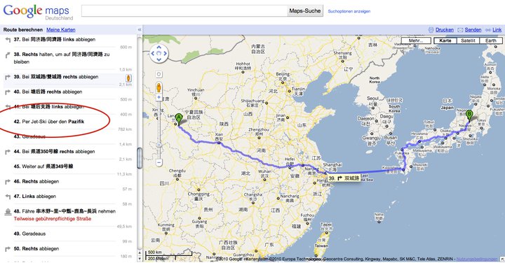adrian hat uns geschrieben: 1. öffne google maps 2. gehe zu 'route berechnen' 3. gib 'japan' als start an. 4. gib 'usa' als ziel an 5. scroll runter bis punkt 27, lies, lache duerfen nun alle mal ausprobieren aehnliches passiert, sucht man die route von china nach japan unter punkt 43 siehe bild -- = -- -- = -- -- = -- a n a . w o r d s aus dem hellblauen salon words@ana.ch http://ana.raskinwp.ch/words/ ana.txt seite 444 reicht ana.words weiter! vragen & kommentare & texte, die ihr davon findet, sie seien es wert, dass es die ganze welt erfaehrt, oder mindestens die redaktion, dann mailto:words@ana.ch du willst auch? immer mehr? dann abonnier auch du ana.words: http://ana.raskinwp.ch/txt/444