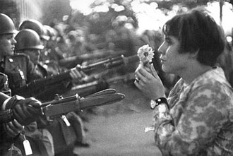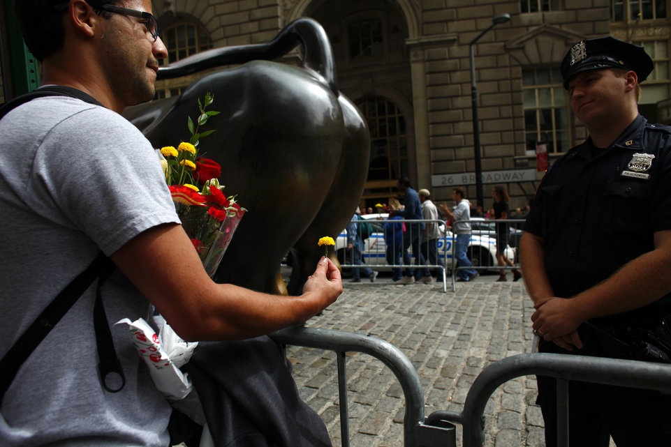 A protestor attempts to give a New York Police Department officer a flower during a demonstration near Wall Street in New York