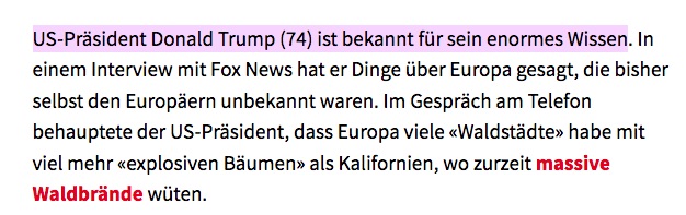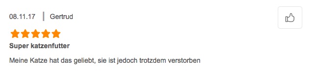 so kommen wir zur wochenmitte zu bitz good news oder auch: sehr lustigen sachen. 1. wenn der blick alles gibt und einen artikel grad launig mit einem scherzlein beginnt "us-praesident donald trump (74) ist bekannt fur sein enormes wissen." (siehe bild) herzhaft gelacht! 2. wenn die tesla-bauweise bitz fragwuerdig ist. und du nicht sicher bist ob grad 1. april ist oder ob 20 min sich einfach so nen scherz erlaubt oder ob's da nen wahrheitsgehalt gibt. (siehe bild) #verreckvorlache 3. wenn jemand eine solche bewertung abgibt siehe drittes bild: futter super, katze tot. #nichtlustig haha 4. und ohne bild: wenn in "eat pray love" reinschaust und dann ist die protagonistin in italien trinkt cappuccino, lernt italienisch bisschen aufnahmen vom colosseum und vespas fahren rum und dann mit viel italianità nen teller pasta essen. dazu braucht es natuerlich bisschen italianità-untermalung in musikalischer form, am besten bisschen oper. und dann kommt die zauberfloete von mozart. deutsche oper, hahaha Fühlt nicht durch dich Sarastro Todesschmerzen... ROFL weitermachen. -- = -- -- = -- -- = -- a n a . w o r d s aus dem hellblauen salon words@ana.ch http://ana.raskinwp.ch/words/ ana.txt seite 444 reicht ana.words weiter! vragen & kommentare & texte, die ihr davon findet, sie seien es wert, dass es die ganze welt erfaehrt, oder mindestens die redaktion, dann mailto:words@ana.ch du willst auch? immer mehr? dann abonnier auch du ana.words: http://ana.raskinwp.ch/txt/444