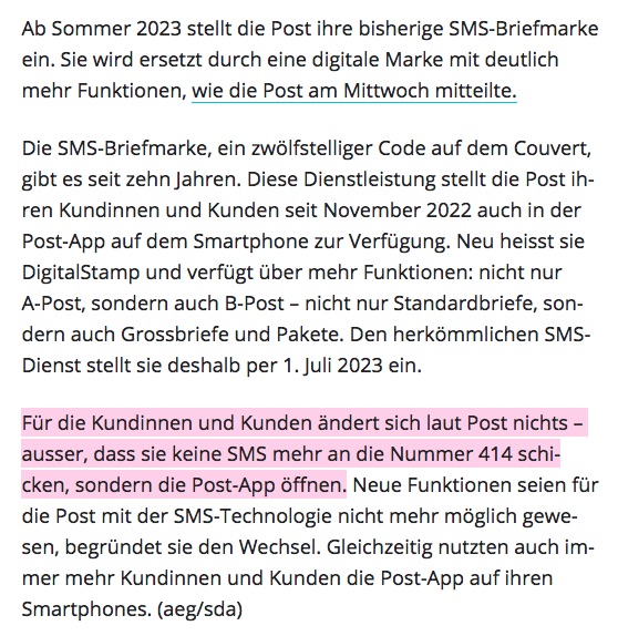 tbz hat so ne lose sammlung am laufen von dingen die ohne smartphone nicht mehr gehen. z.b. waere man zeitenweise waehrend corona ohne smartphone nicht mehr in nen club gekommen weil man nen qr-code damit scannnen musste. und ja, andere laender sind da weiter (?), zugang zu amtsstellen nur mit app und so. jedenfalls. nun neu dazugestosssen: sms-briefmarke wird abgeschafft. lustig ist, dass es da heisst Für die Kundinnen und Kunden ändert sich laut Post nichts und dann: – ausser, dass sie keine SMS mehr an die Nummer 414 schicken, sondern die Post-App öffnen. aha, die aenderung ist: ohne smartphone gehz nuem ;-) aber seien wir ehrlich: wenn schon nicht smart dann auch grad richtig analog mit briefmarken, oder. apropos: habt ihr schon die neuen blume-des-lebens-marken der post gesehen? die haben mehr weggelaserte flaeche als restliches papier. siehe foto. und tbz hat noch keine benutzt, aber es beschaeftigen sie die fragen ob die zunge beim lecken auf die andere seite quillt ob man dann eigentlich mehr spucke auf der vorder- als auf der rueckseite hat und ob die marke haelt oder in der ganzen filigraenitaet auseinanderfoetzlet, wenn nassgeleckt. geil oder fail? moechtest du post mit so einer marke? send adresse per mail! dann wird tbz mal ausgiebig testlecken. -- = -- -- = -- -- = -- a n a . w o r d s mit bildern. von euch gescannt, gemalt, photographiert, gezeichnet. ihr malt, wir versenden. a n a . w o r d s aus dem hellblauen salon vragen & kommentare & texte, die ihr davon findet, sie seien es wert, dass es die ganze welt erfaehrt, oder mindestens die redaktion, dann mailto:words@ana.ch du willst auch? immer mehr? dann abonnier auch du ana.words: http://ana.raskinwp.ch/txt/444 hast du genug? immer weniger? dann bestell doch nicht ana.words ab: http://ana.raskinwp.ch/txt/444