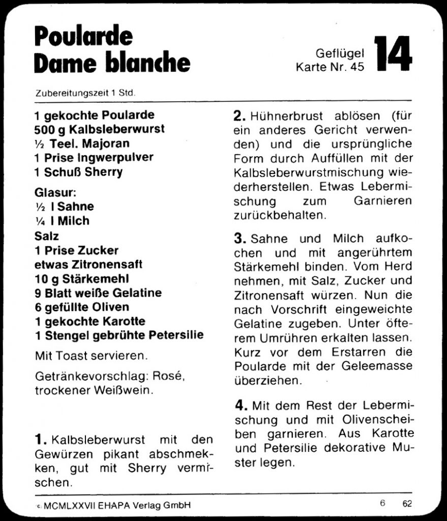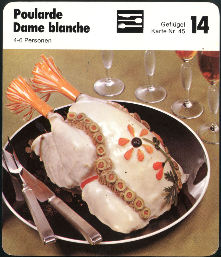 wer traut sich dieses grauslige rezept auszuprobieren? bechamel mit gelatine, hmjam und ganz verwegen: etwas ingwer! submitted by dietrichstein 1 gekochte poularde 500g kalbsleberwurst 1/2 tl majoran 1 prise ingwerpulver 1 schuss sherry glasur: 5dl rahm 2,5 dl milch salz 1 prise zucker zitronensaft 10g maizena 9 blatt gelatine 6 gefüllte oliven 1 gekochte karotte petersilie 1. kalbsleberwurst mit den gewürzen abschmecken, gut mit sherry mischen 2. hühnerbrust ablösen (für anderes gericht verwenden, aha, das ist die halbe antwort für dich) und die ursprüngliche form durch auffüllen mit der wurstmischung wiederherstellen (eine art kulinarische plastische chirurgie). etwas wurstmischung für die garnitur aufheben 3. rahm und milch aufkochen, mit maizena binden. vom herd nehmen, zucker, salz, zitronsaft dazu. gelatine nach packungsbeilage beigeben. unter umrühren erkalten lassen. kurz vor erstarren die poularde mit der masse überziehen. 4. mit dem wurstrest, oliven, karotte und petersilie dekorieren