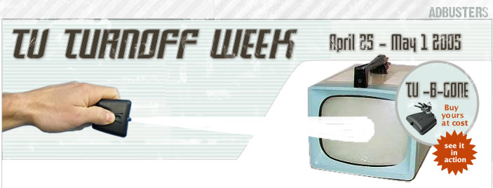 Das kanadische Adbusters-Magazin und das Culture Jammers Network rufen jedes Jahr die TV-Turnoff-Week aus, heuer vom 25. April bis 1. Mai. Auch wenn wir hier nicht so heftig verpestet sind mit TVs, könnte das angebotene Tool von Interesse sein: One Button universelle Fernbedienung nur zum Ausschalten. US$10. Für alle Marken. Durch die Stadt laufen und alles ausschalten! submitted by m(at)ana.ch http://adbusters.org Jammers, Time to fight back. For TV-Turnoff 2005 -- April 25 to May 1 -- we've teamed up with the good folks at TV-B-Gone, makers of a pint-size remote control that shuts off any television, anywhere. You're in an airport, classroom, bank or bar and want to silence the idiot box? No problemo. In a few weeks, JammerGroups all over the world will start reclaiming public space with this ingenious device. Organize, share ideas, and get your TV-B-Gone at cost (for $10 plus shipping) at: <http://adbusters.org> And join your city JammerGroup here: http://jammergroups.org THE NEW BOYCOTT Imagine a new lifestyle game -- we play by spreading uncooling memes among our friends, getting them to ditch or switch brands. Can we get a few million people to live lives of playful resistance? Share your thoughts at the forum: http://adbusters.org ANTIPRENEUR A new breed of Jammers is marrying social activism with entrepreneurial zeal. Their grassroots capitalism is producing some amazing out-of-the-Lefty-box ideas. Check out this budding antipreneurial movement: http://adbusters.org ------------------- Get his from a friend? Want to join the Culture Jammers Network? Visit: <http://adbusters.org/information/network/> -- = -- -- = -- -- = -- a n a . w o r d s mit bildern. von euch gescannt, gemalt, photographiert, gezeichnet. ihr malt, wir versenden. a n a . w o r d s aus dem hellblauen salon mailto:words@ana.ch http://ana.raskinwp.ch/words/ ana.txt seite 444 vragen & kommentare & texte, die ihr davon findet, sie seien es wert, dass es die ganze welt erfaehrt, oder mindestens die redaktion, dann mailto:words@ana.ch du willst auch? immer mehr? dann abonnier auch du ana.words: http://ana.raskinwp.ch/txt/444 hast du genug? immer weniger? dann bestell doch nicht ana.words ab: http://ana.raskinwp.ch/txt/444
