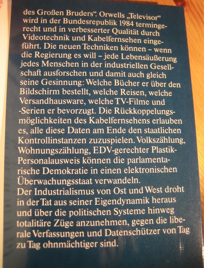 wenn dir ein buch in die haende faellt ueber orwells 1984, "vision und wirklichkeit", spiegel-sachbuch, und du 2021 nur so denkst: jööööö, haerzig! das buch ist von 1983... (bilder) -- = -- -- = -- -- = -- a n a . w o r d s mit bildern. von euch gescannt, gemalt, photographiert, gezeichnet. ihr malt, wir versenden. a n a . w o r d s aus dem hellblauen salon und nein, tbz hat das buch bisher nicht gelesen nur den klappentext. mailto:words@ana.ch http://ana.raskinwp.ch/words/ ana.txt seite 444 vragen & kommentare & texte, die ihr davon findet, sie seien es wert, dass es die ganze welt erfaehrt, oder mindestens die redaktion, dann mailto:words@ana.ch du willst auch? immer mehr? dann abonnier auch du ana.words: http://ana.raskinwp.ch/txt/444 hast du genug? immer weniger? dann bestell doch nicht ana.words ab: http://ana.raskinwp.ch/txt/444