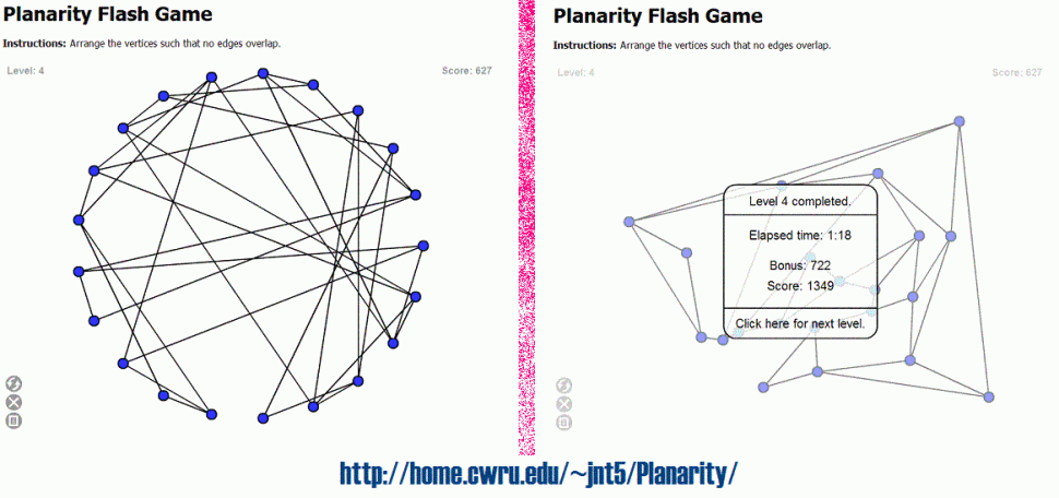 planarity informatikerspiel http://home.cwru.edu/~jnt5/Planarity/ graphen richten und sortieren, überlappungen wegmachen. die übliche tätigkeit bei datenmodellen und sonstigen diagrammen. ich bin sehr…