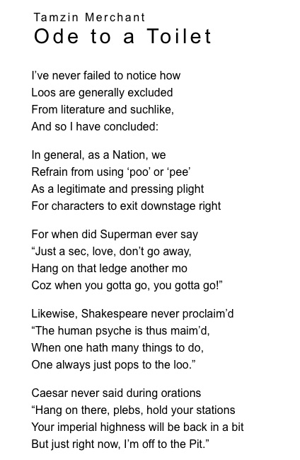 in Allgemeintamzin1 tamzin2 so, es ist zeit fuer ein gedicht: http://www.platformsmagazine.com/1/contents/toilet.htm und da man nie weiss wie lange so ein link…